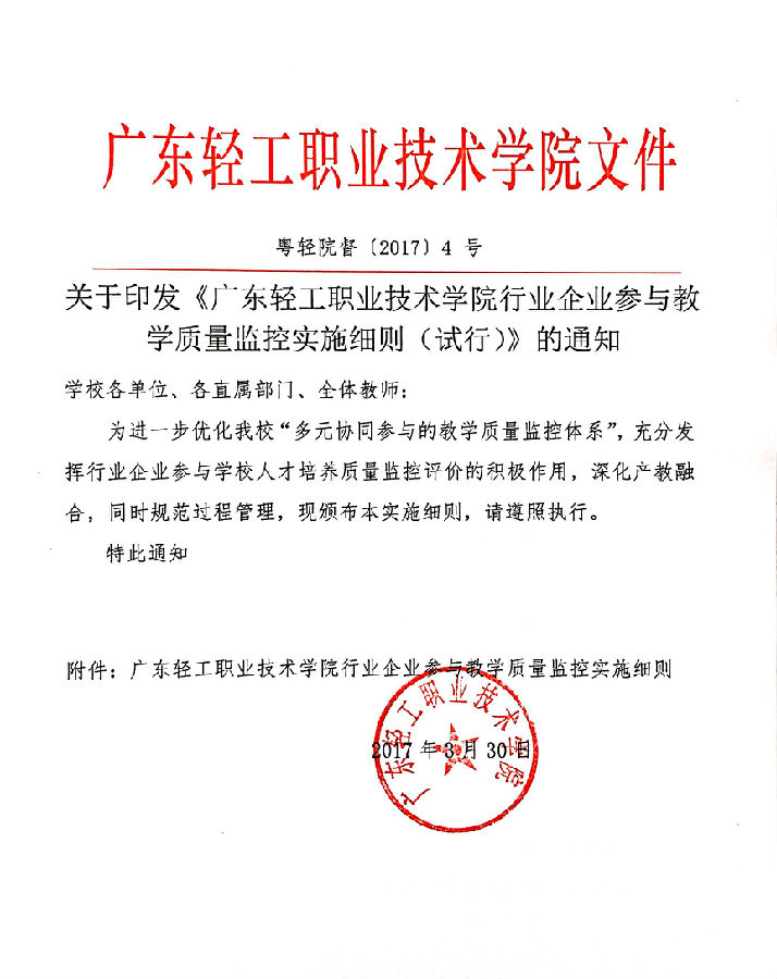 关于印发《广东轻工职业技术学院行业企业参与教学质量监控实施细则(试行)》的通知