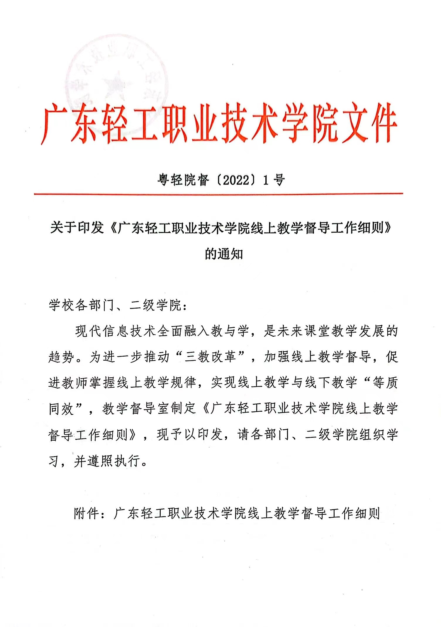 关于印发《广东轻工职业技术学院线上教学督导工作细则》的通知〔2022〕1号粤轻院督