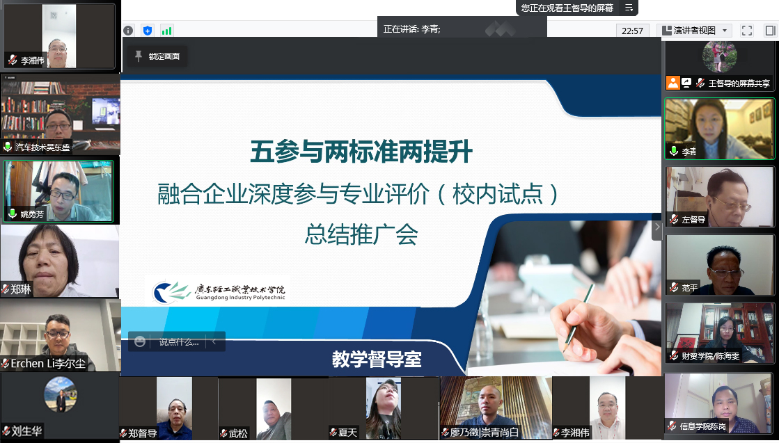 3月3日晚,校教学督导室召开了“五参与两标准两提升融合企业深度参与专业评价推广总结会”的线上会议。参加人员包括各学院“自我诊断+企业参与”的前三批11个专业的负责人、第四批(待完成)10个专业的负责人、职业教育研究所(教学督导室)老师。会议由督导组组长王漓江主持,职业教育研究所(教学督导室)主任李青教授致辞。李主任阐述了项目的背景、实施的意义及其在我校开展的现状,并就填写结题报告中“课程合理(符合)性确认反思表”和“企业专家评价意见表”的填报重要事项进行了说明。已完成的11个专业代表针对参与过程做了汇报发言,总结了在“自我诊断+企业参与”工作中的体会与收获,畅谈了校企合作开展专业建设的成效,反思其中存在的问题并提出了改进措施,明确了未来专业发展方向,为正在开展“自我诊断+企业参与”的专业提供了宝贵经验。