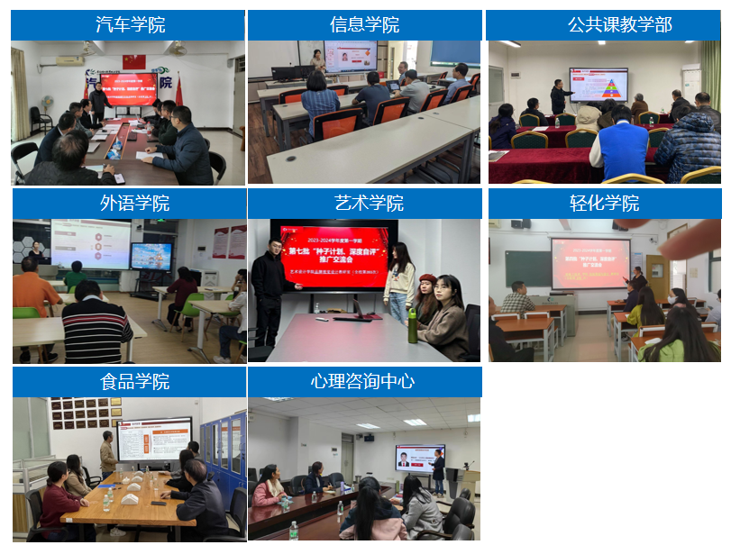 汽车技术学院、信息技术学院学院、公共课教学部、应用外语学院、艺术设计学院、轻化工技术学院、食品与生物技术学院、心理健康咨询中心等二级督导组共同开展线上线下深度自评推广会,自评典型教师在会上以PPT汇报讲解其自评总结,并与教研室老师开展交流。