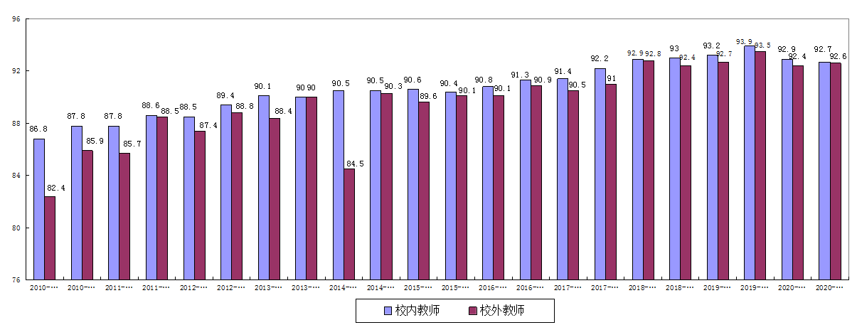 5.校内与外聘教师综合评分比较。校内、外聘教师22个学期的综合评教分数呈平稳上升趋势,详见图5。
