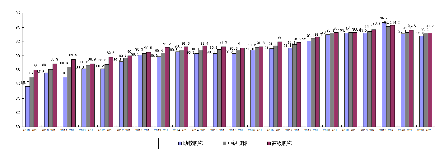4.不同职称的综合评教分数比较。近22个学期的初级、中级和高级职称教师的三方综合评分,均呈平稳上升趋势,详见图4。