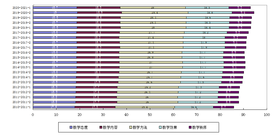 3.学生评价各分项结果趋势。近22个学期,“教学态度” “教学内容” “教学方法” “教学效果” “教学秩序”5项评价结果呈稳步提高趋势,详见图3。