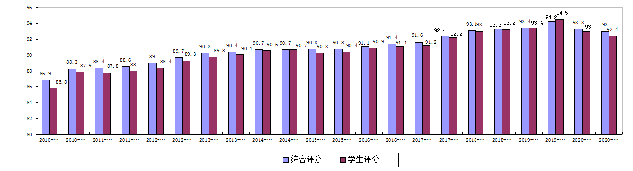 1.学生评教和三方综合评教平均分趋势。近22个学期的全校学生评教和三方综合评教平均分均呈平稳上升趋势,详见图1。