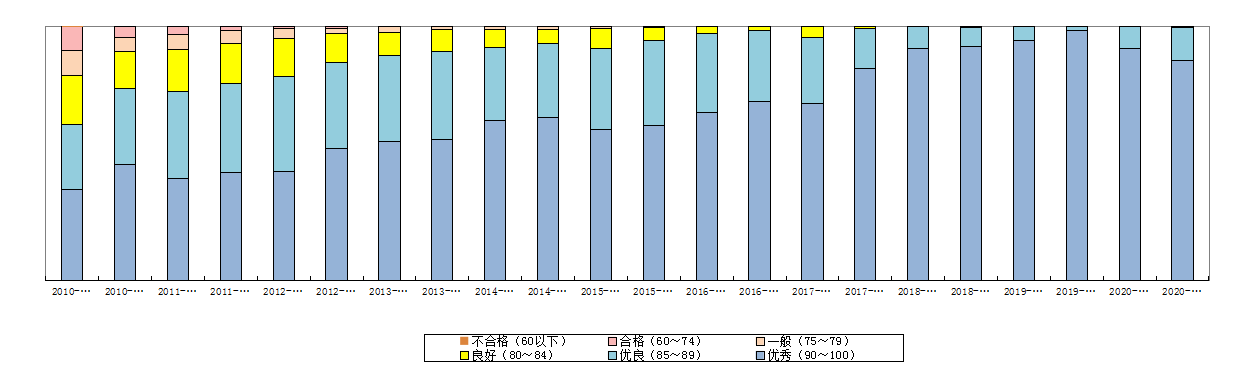 2.学生评教各分数段比例趋势。近22个学期,合格(60~74分)的课程比率由2010-2011-1学期的9.4%下降到0%,优秀(90~100分)的课程比率由35.7%上升到86.5%,不合格(60分以下)的课程比率连续16个学期为0%,详见图2。