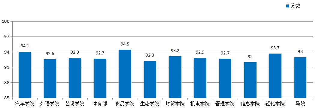 6.各二级学院学生评教平均分与全校综合平均分状况。本学期,全校学生评教平均分为92.6分,三方综合评教平均分为93.1。总体上,各二级学院学生评教平均分均比以往有所提高,详见图6。