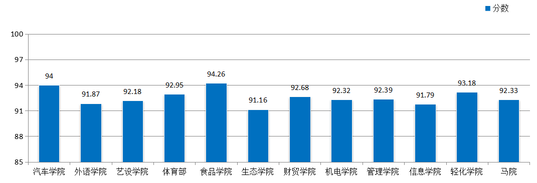 6.各二级学院学生评教平均分与全校综合平均分状况。本学期,全校学生评教平均分为94.56分,三方综合评教平均分为94.37。总体上,各二级学院学生评教平均分均比以往有所提高,详见图6。