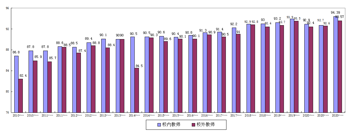 5.校内与外聘教师综合评分比较。校内、外聘教师23个学期的综合评教分数呈平稳上升趋势,详见图5。