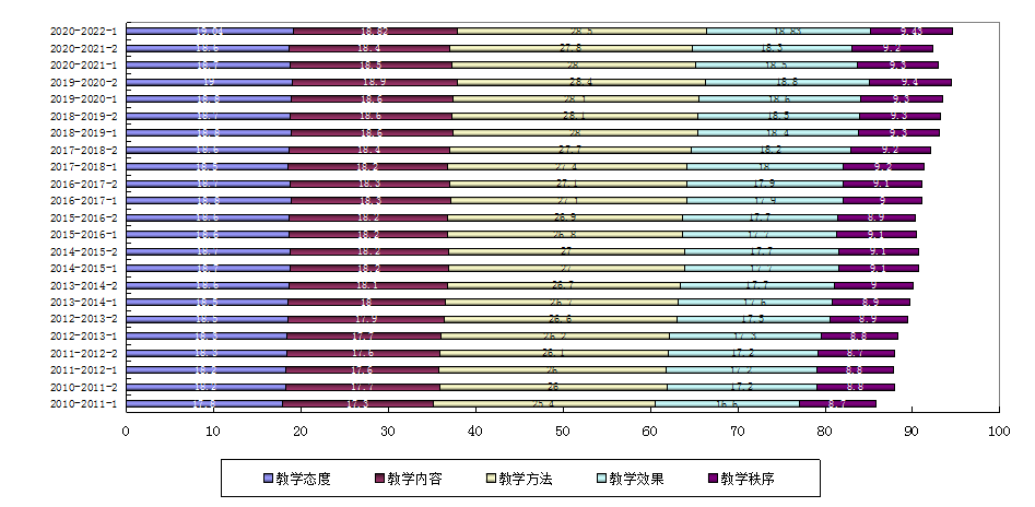 3.学生评价各分项结果趋势。近23个学期,“教学态度” “教学内容” “教学方法” “教学效果” “教学秩序”5项评价结果呈稳步提高趋势,详见图3。
