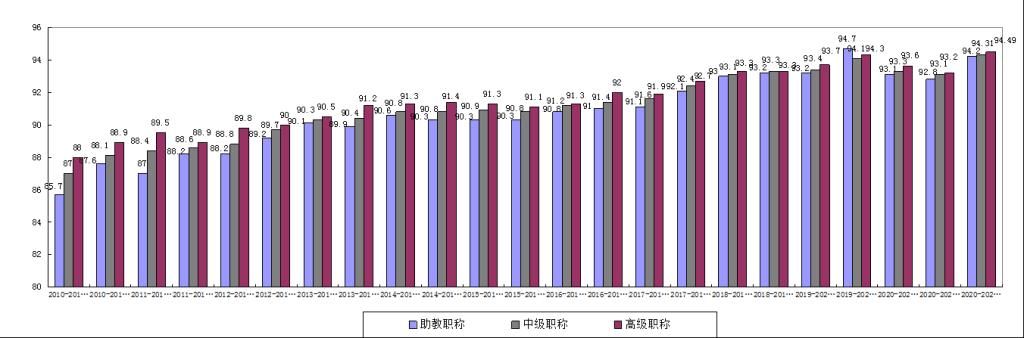 4.不同职称的综合评教分数比较。近23个学期的初级、中级和高级职称教师的三方综合评分,均呈平稳上升趋势,详见图4。