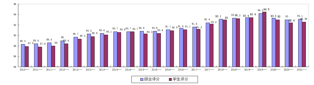 1.学生评教和三方综合评教平均分趋势。近23个学期的全校学生评教和三方综合评教平均分均呈平稳上升趋势,详见图1。
