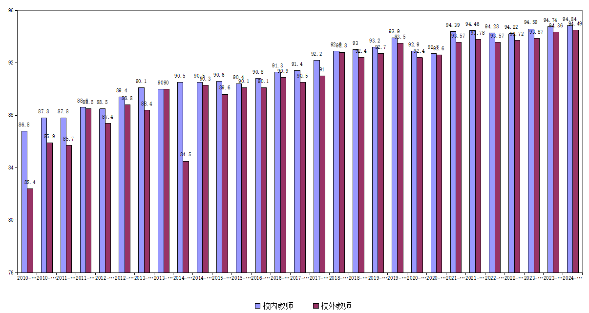 5.校内与外聘教师综合评分比较。校内、外聘教师29个学期的综合评教分数呈平稳上升趋势,详见图5。