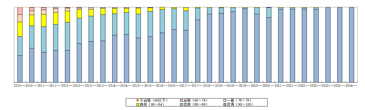 2.学生评教各分数段比例趋势。近29个学期,合格(60~74分)的课程比率由2010-2011-1学期的9.4%下降到0%,优秀(90~100分)的课程比率由35.7%上升到98.41%,不合格(60分以下)的课程比率连续20个学期为0%,详见图2。