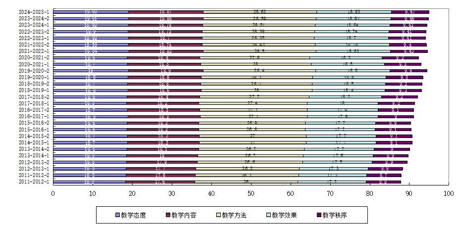 3.学生评价各分项结果趋势。近29个学期,“教学态度” “教学内容” “教学方法” “教学效果” “教学秩序”5项评价结果呈稳步提高趋势,详见图3。