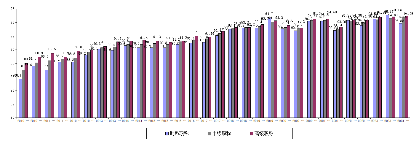 4. 不同职称的综合评教分数比较。近29个学期的初级、中级和高级职称教师的三方综合评分,均呈平稳上升趋势,有些许波动。详见图4。