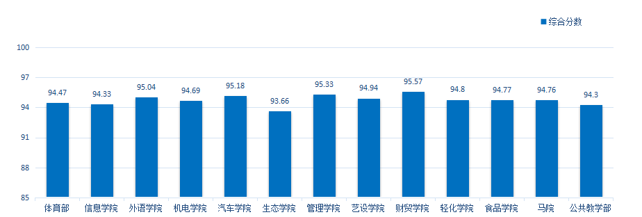 6.各二级学院学生评教平均分与全校综合平均分状况。本学期,全校学生评教平均分为94.9分,三方综合评教平均分为94.82。总体上,各二级学院学生评教平均分均比以往有所提高,详见图6。